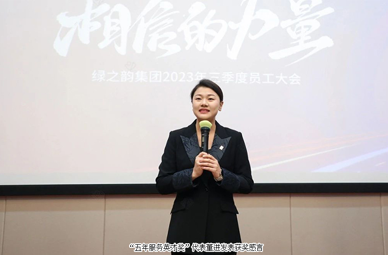 在全場熱烈的掌聲和萬眾矚目中,綠之韻集團胡國安董事長發(fā)表重要講話。他再次對全體員工的努力和付出表示肯定,對第三季度所有獲獎員工致以衷心祝賀,并對獲獎員工給予期許,希望大家能發(fā)揮才干,為公司向前發(fā)展提供動力。他表示,綠之韻成立二十年,經(jīng)歷無數(shù)艱辛曲折,收獲了質(zhì)的飛躍與發(fā)展。20歲的綠之韻擁有積極向上、創(chuàng)新求變的精神力量,希望大家繼續(xù)發(fā)揚綠之韻精神,堅持為用戶提供有價值的產(chǎn)品和服務(wù)不改變;為員工提供收獲成長的價值不改變;為社會合作伙伴創(chuàng)造價值不改變。他提出了三點寄望,一是希望所有綠之韻人可以躬身入局、親力親為;二是成為真正為公司解決問題的人;三是希望所有人都有降本增效、化繁為簡的能力,可以對結(jié)果負責(zé)。未來,期待所有綠之韻人永懷感恩之心,積極參與公司發(fā)展建設(shè),同頻共振、同舟共濟、共同成長。相信在綠之韻這棵大樹之下,所有的福氣都會如綠蔭,庇護著所有綠之韻人,讓綠之韻蓬勃健康發(fā)展,我們現(xiàn)在唯一要做的就是最好的自己,所有一切美好必將如約而至!