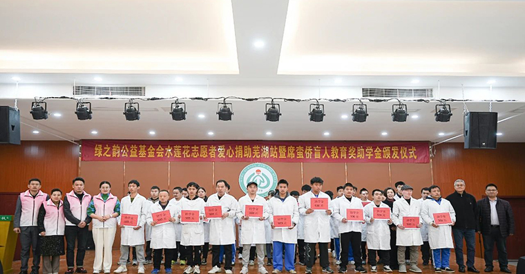 綠之韻水蓮花公益專項(xiàng)基金愛心捐助2023年度蕪湖盲校席蠻僑盲人教育助學(xué)金共30000元,以及10000元樂器和5000元的零食禮包。