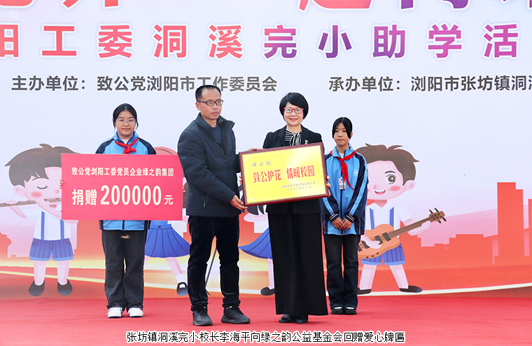 活動(dòng)伊始,中共瀏陽(yáng)市張坊鎮(zhèn)黨委副書(shū)記、鎮(zhèn)長(zhǎng)石盼在致辭中感謝了致公黨長(zhǎng)沙市委、瀏陽(yáng)市委以及愛(ài)心企業(yè)綠之韻對(duì)學(xué)校及孩子們的關(guān)愛(ài)與幫助。致公黨瀏陽(yáng)工委主委、科技局局長(zhǎng)鄧恩介紹助學(xué)情況。隨后,綠之韻公益基金會(huì)副理事長(zhǎng)、綠之韻集團(tuán)黨委書(shū)記劉云上臺(tái)向張坊鎮(zhèn)洞溪完小捐贈(zèng)20萬(wàn)元愛(ài)心支票。張坊鎮(zhèn)洞溪完小校長(zhǎng)李海平向綠之韻公益基金會(huì)回贈(zèng)愛(ài)心牌匾。