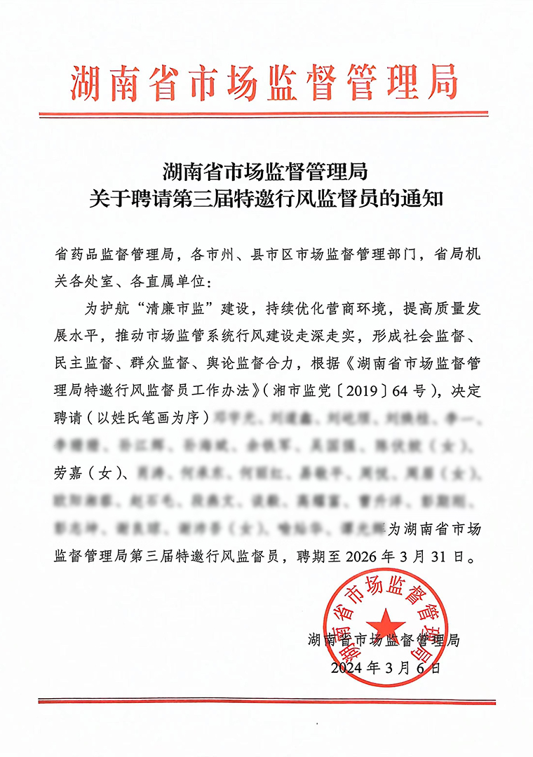 2024年3月6日,全省市場監(jiān)管系統(tǒng)黨風廉政建設(shè)暨行風建設(shè)工作推進會在長沙召開。省局黨組成員、副局長廖健主持會議并傳達習近平總書記在中紀委三次全會上的重要講話精神,省局黨組成員、副局長丁珍良宣讀省局系統(tǒng)清廉單元樣本第一批選樹對象名單,省紀委監(jiān)委駐省局紀檢監(jiān)察組組長、黨組成員鄧志華傳達省紀委全會精神并講話。湖南省政協(xié)委員、綠之韻集團總裁勞嘉受邀參加會議,并被續(xù)聘為湖南省市場監(jiān)督管理局第三屆特邀行風監(jiān)督員。