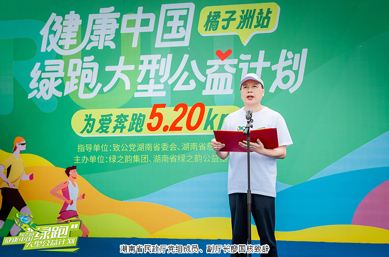 湖南省民政廳黨組成員、副廳長(zhǎng)廖國(guó)核致辭。他表示,今天,我們以愛之名、善之行,共同參與、共同見證、共同推進(jìn)2024綠之韻“健康中國(guó)—綠跑”大型公益活動(dòng)。湖南省慈善總會(huì)聯(lián)合綠之韻集團(tuán)共同舉辦“綠跑活動(dòng)”,倡導(dǎo)人人慈善的理念,踐行綠色發(fā)展理念,將“健康”與“公益”相結(jié)合,將“惠己”與“助人”相結(jié)合,激發(fā)向善向上正能量,凝聚社會(huì)公益心。綠跑已經(jīng)持續(xù)舉辦了9屆,每一屆都設(shè)定了不同的公益主題、吸引了公眾廣泛參與、匯聚了強(qiáng)大的慈善力量、展現(xiàn)了湖南的人文新貌。綠之韻集團(tuán)自成立以來(lái),堅(jiān)守“讓善行成為生命習(xí)慣”的理念,主動(dòng)承擔(dān)社會(huì)責(zé)任,致力于傳遞愛的力量,為湖南慈善事業(yè)做出了積極貢獻(xiàn)。綠之韻發(fā)起的“綠跑活動(dòng)”,充分體現(xiàn)了綠之韻優(yōu)秀的企業(yè)文化和強(qiáng)烈的社會(huì)擔(dān)當(dāng)。希望大家能跑出健康的身體,跑出幸福的人生,跑出愛心的力量,跑出文明的風(fēng)景,讓奔跑的身影成為橘子洲頭最生動(dòng)的景致,讓大家奉獻(xiàn)的善舉成為山水洲城最美好的畫卷。