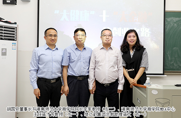 2019年6月23日,湖南師范大學客座教授、綠之韻集團董事長胡國安應湖南師范大學邀請,為“湖南師范大學第六屆MBA企業(yè)案例大賽暨全國管理案例精英賽校園突圍賽”作評委主席。并以《“大健康”+“大金融” 的創(chuàng)業(yè)之路》為主題,為湖南師范大學2018級MBA學員、金融碩士、工商管理研究生100余人帶來一場振奮人心、精彩紛呈的講座。通過分享自己真實的創(chuàng)業(yè)故事,鼓勵學員們不要因為迷茫而虛度光陰,在未來的生活中,永遠不要停止前進的腳步,不放棄最初的夢想。