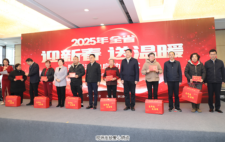 隨后,湖南省人民政府副省長王俊壽、湖南省人民政府辦公廳一級巡視員孟祥定,湖南省民政廳廳長黃東紅,中共湖南省委宣傳部二級巡視員楊勇,湖南省應(yīng)急管理廳黨委委員、副廳長朱毅,湖南省糧食和物資儲備局黨組成員、副局長覃世民等領(lǐng)導(dǎo)上臺為困難群眾代表發(fā)放愛心物資。湖南省人民政府副省長王俊壽宣布2025年湖南省“迎新春 送溫暖”慰問活動正式啟動。
