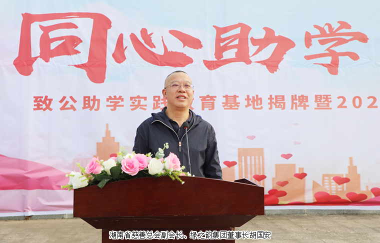 中共安化縣委副書記、統(tǒng)戰(zhàn)部部長(zhǎng)代虹宇致歡迎辭。他首先對(duì)一直大力支持教育事業(yè)的綠之韻集團(tuán)愛(ài)心團(tuán)隊(duì)給予高度贊許。同時(shí)表示,2021年,致公黨湖南省委員會(huì)與我縣簽訂《助力鄉(xiāng)村振興戰(zhàn)略“致安合作”框架協(xié)議》,通過(guò)產(chǎn)業(yè)幫扶、教育助學(xué)、醫(yī)療義診等務(wù)實(shí)舉措,累計(jì)投入幫扶資金860萬(wàn)元,實(shí)施項(xiàng)目 23個(gè),為安化鄉(xiāng)村振興注入強(qiáng)勁動(dòng)能。胡國(guó)安董事長(zhǎng)設(shè)立“綠韻圓夢(mèng)”獎(jiǎng)教獎(jiǎng)學(xué)金,已經(jīng)連續(xù)三年每年向?qū)W校捐贈(zèng)人民幣10萬(wàn)元整,累計(jì)惠及師生420人次,彰顯了新時(shí)代企業(yè)家的教育情懷和責(zé)任擔(dān)當(dāng)。安化大橋?qū)W校作為冷市鎮(zhèn)教育的窗口,近年來(lái)在各方支持下,辦學(xué)條件顯著改善,教學(xué)質(zhì)量穩(wěn)步提升。今天實(shí)踐教育基地揭牌,既是總結(jié)更是啟航。期盼學(xué)校深化合作,在課程共建、師資培育等方面創(chuàng)新突破,打造鄉(xiāng)村教育振興示范樣本。希望同學(xué)們立鴻鵠志、做追夢(mèng)人,將感恩之心轉(zhuǎn)化為“強(qiáng)國(guó)有我”的奮斗力量,讓青春在傳遞愛(ài)心中綻放光彩。讓我們以此次活動(dòng)為新起點(diǎn),凝聚各方力量,厚植教育情懷,持續(xù)推動(dòng)城鄉(xiāng)教育優(yōu)質(zhì)均衡發(fā)展,為鄉(xiāng)村振興培育更多生力軍。