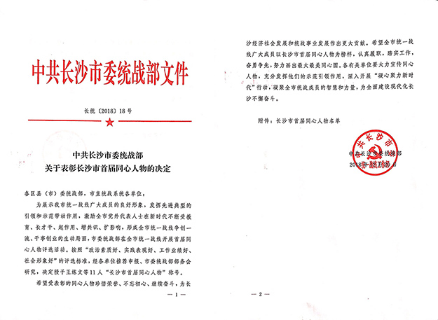 2018年12月24日,長沙市首屆同心人物頒獎典禮暨凝心聚力新時代行動推進(jìn)會在長沙舉行。中共湖南省委統(tǒng)戰(zhàn)部副部長龍建湘,中共長沙市委常委、統(tǒng)戰(zhàn)部長譚小平,長沙市人民政府副市長、長沙市知聯(lián)會會長劉明理,長沙市政協(xié)副主席、農(nóng)工黨市委主委龔振湘等領(lǐng)導(dǎo)出席會議。中國致公黨黨員、湖南省政協(xié)委員、湖南省工商聯(lián)(總商會)副會長、綠之韻集團(tuán)董事長胡國安受邀出席頒獎典禮,獲評長沙市首屆“十大同心人物”。