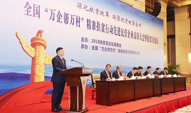 會(huì)議由全國工商聯(lián)副主席、中國光彩事業(yè)促進(jìn)會(huì)副會(huì)長謝經(jīng)榮主持。中央統(tǒng)戰(zhàn)部副部長,全國工商聯(lián)黨組書記、常務(wù)副主席、中國光彩事業(yè)促進(jìn)會(huì)會(huì)長徐樂江宣讀了關(guān)于表彰100家全國“萬企幫萬村”精準(zhǔn)扶貧行動(dòng)先進(jìn)民營企業(yè)的決定。全國政協(xié)副主席、全國工商聯(lián)主席高云龍出席會(huì)議,并指出:“萬企幫萬村”精準(zhǔn)扶貧行動(dòng)是民營企業(yè)家貫徹落實(shí)習(xí)近平新時(shí)代中國特色社會(huì)主義思想的生動(dòng)實(shí)踐,歷經(jīng)三年實(shí)踐,取得了明顯成效,民營企業(yè)精準(zhǔn)扶貧的模式創(chuàng)新豐富了中國特色扶貧開發(fā)理論,為全國脫貧攻堅(jiān)在思路上提供了有益借鑒;民營企業(yè)充分發(fā)揮市場機(jī)制靈活、吸納就業(yè)主渠道、公益基金量大面廣等方面優(yōu)勢,激發(fā)貧困群眾內(nèi)生動(dòng)力,阻斷貧困代際傳遞,幫助構(gòu)建了脫貧長效機(jī)制。