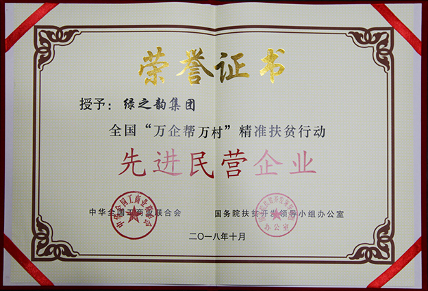 為表彰先進(jìn)、激勵(lì)和帶動(dòng)更多民營企業(yè)踴躍投身脫貧攻堅(jiān)戰(zhàn),經(jīng)報(bào)請中央批準(zhǔn),層層推薦、逐級公示、嚴(yán)格評審,中華全國工商業(yè)聯(lián)合會(huì)、國務(wù)院扶貧辦授予100家民營企業(yè)全國“萬企幫萬村”精準(zhǔn)扶貧行動(dòng)先進(jìn)民營企業(yè)稱號。綠之韻集團(tuán)勇于擔(dān)當(dāng)社會(huì)責(zé)任,在企業(yè)健康發(fā)展的同時(shí),發(fā)揚(yáng)中華民族扶危濟(jì)困的優(yōu)良傳統(tǒng),聚焦精準(zhǔn)扶貧加強(qiáng)模式創(chuàng)新,為廣大民營企業(yè)做出了表率,被中華全國工商業(yè)聯(lián)合會(huì)、國務(wù)院扶貧開發(fā)領(lǐng)導(dǎo)小組辦公室評為全國“萬企幫萬村”精準(zhǔn)扶貧行動(dòng)先進(jìn)民營企業(yè)。