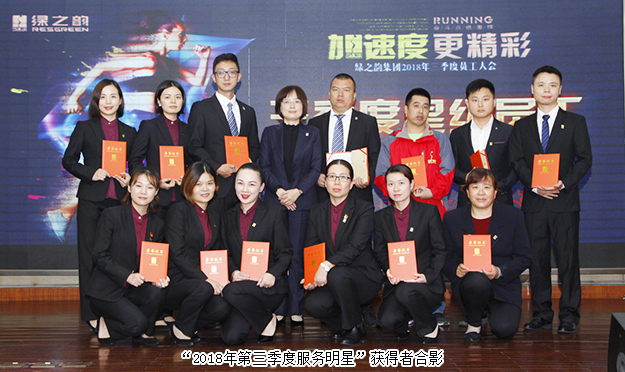 為表彰先進(jìn)、凝聚力量,進(jìn)一步激勵(lì)全體員工的積極性和奮斗激情,大會(huì)集中頒發(fā)了“三季度優(yōu)秀服務(wù)集體”“三季度服務(wù)明星”“五年服務(wù)英才獎(jiǎng)”“十年服務(wù)忠誠(chéng)獎(jiǎng)”等獎(jiǎng)項(xiàng)。市場(chǎng)管理中心、公共事務(wù)部、遼寧分公司、保安組榮獲“2018年第三季度優(yōu)秀集體”稱號(hào);王艷、馮月超、張帥、楊恬、侯俊霞、楊邢軒、戴明玉、彭芳、劉靜、劉薇、康冠軍、戴明勇、肖巧林、劉燚淼被評(píng)為“2018年第三季度星級(jí)優(yōu)秀員工”;劉維利、曹兵、程瑤、張艷、徐燕燕、尹天弈、賀煒、顏洋、楊邢軒、張智皓、張雅麗榮膺“五年服務(wù)英才獎(jiǎng)”;胡湖、黃姣、李定、趙軍、龍雅鳳、劉磊榮膺“十年服務(wù)忠誠(chéng)獎(jiǎng)”。綠之韻集團(tuán)總經(jīng)理劉維利,綠之韻集團(tuán)副董事長(zhǎng)高宇,綠之韻集團(tuán)董事、總裁勞嘉先后上臺(tái)為獲獎(jiǎng)員工頒發(fā)了獎(jiǎng)?wù)屡c榮譽(yù)證書,并致以熱烈祝賀?!拔迥攴?wù)英才獎(jiǎng)”代表張雅麗和“十年服務(wù)忠誠(chéng)獎(jiǎng)”代表龍雅鳳分別發(fā)表了獲獎(jiǎng)感言。