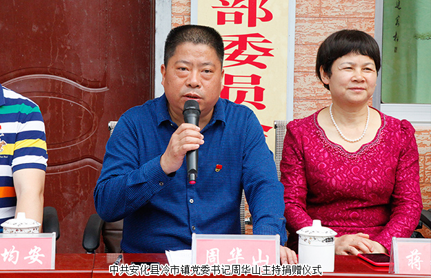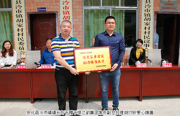 捐贈(zèng)儀式由中共安化縣冷市鎮(zhèn)黨委書(shū)記周華山主持?;顒?dòng)伊始,中共安化縣冷市鎮(zhèn)黨委副書(shū)記、鎮(zhèn)長(zhǎng)方平向大家簡(jiǎn)單介紹了胡家村的發(fā)展和扶貧情況。他在講話(huà)中對(duì)胡國(guó)安董事長(zhǎng)飲水思源,回饋家鄉(xiāng)的善舉,對(duì)綠之韻集團(tuán)精準(zhǔn)扶貧、回報(bào)桑梓的高尚情操表示了高度的肯定與贊許。他表示,冷市鎮(zhèn)委、胡家村村委一定會(huì)懷著感恩的心態(tài),將這筆善款用到胡家村的基礎(chǔ)設(shè)施建設(shè)當(dāng)中,將胡國(guó)安董事長(zhǎng)的愛(ài)心善舉發(fā)揮出更大的效益。隨后 ,胡家村支部書(shū)記胡利民向大家匯報(bào)了用于修建公路的捐贈(zèng)款的使用情況。湖南省政協(xié)委員、湖南省工商聯(lián)(總商會(huì))副會(huì)長(zhǎng)、綠之韻集團(tuán)董事長(zhǎng)胡國(guó)安向胡家村村委會(huì)捐贈(zèng)60萬(wàn)元款物支票。中共安化縣冷市鎮(zhèn)鎮(zhèn)長(zhǎng)方平、胡家村支部書(shū)記胡利民代表冷市鎮(zhèn)政府分別向綠之韻集團(tuán)常務(wù)副總經(jīng)理胡均安、黨委書(shū)記劉云頒發(fā)了愛(ài)心捐贈(zèng)牌匾。