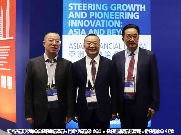 2018年1月15—16日,由香港特別行政區(qū)政府及香港貿(mào)易發(fā)展局共同主辦的“2018亞洲金融論壇”在香港會(huì)議展覽中心舉行。中華人民共和國香港特別行政區(qū)行政長官林鄭月娥,香港貿(mào)易發(fā)展局主席羅康瑞,中國證券監(jiān)督管理委員會(huì)副主席姜洋;俄羅斯第一副總理舒瓦洛夫,美國第76任財(cái)政部長杰克盧,國際貨幣基金組織第一副總裁大衛(wèi)?利普頓,亞洲開發(fā)銀行行長中尾武彥,盧森堡財(cái)政部長皮埃爾·格拉美亞,亞洲基礎(chǔ)設(shè)施投資銀行行長、董事會(huì)主席金立群,匯豐控股有限公司集團(tuán)行政總裁歐智華等100多位來自全球各地的財(cái)金官員、經(jīng)濟(jì)學(xué)家、跨國企業(yè)管理層和財(cái)金專家出席會(huì)議。中共長沙市委常委、副市長付勝華,長沙市委組織部副部長張白云,長沙市政府金融辦主任李曉斌等攜長沙市金融代表團(tuán)參加會(huì)議。湖南省工商聯(lián)(總商會(huì))副會(huì)長、香港湘都同鄉(xiāng)會(huì)名譽(yù)會(huì)長、香港長沙商會(huì)副會(huì)長、綠之韻集團(tuán)董事長、綠韻控股集團(tuán)董事局主席胡國安受邀參加會(huì)議。