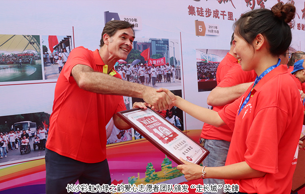 用腳步丈量愛(ài)心,用公益詮釋生命?;顒?dòng)結(jié)束后,愛(ài)心志愿者和其他愛(ài)心團(tuán)隊(duì)成員、義工們彼此分享了行走過(guò)程中感人的故事和感悟。來(lái)自長(zhǎng)沙彩虹的國(guó)際義工和晨光中心的孩子們?yōu)橹驹刚邆儙?lái)了精心準(zhǔn)備的感恩答謝節(jié)目。閉幕式上,綠之韻集團(tuán)董事總裁、綠之韻公益基金會(huì)理事長(zhǎng)勞嘉為本次活動(dòng)致辭:今年,是長(zhǎng)沙彩虹“走長(zhǎng)城”活動(dòng)的第十一個(gè)年頭,綠之韻愛(ài)心志愿者已連續(xù)多年參加了此項(xiàng)公益活動(dòng)。我們攜手與孩子們一起行走,以實(shí)際行動(dòng)號(hào)召各界愛(ài)心人士、企業(yè)參與到公益慈善的行列,為孤殘兒童獻(xiàn)愛(ài)心。奉獻(xiàn)一份愛(ài)心,就能點(diǎn)燃一片希望。今后,綠之韻將一如既往地支持各項(xiàng)公益慈善事業(yè),用實(shí)際行動(dòng)去詮釋愛(ài),傳遞愛(ài),分享愛(ài)?;顒?dòng)最后,國(guó)際義工們還為愛(ài)心團(tuán)隊(duì)、綠之韻愛(ài)心志愿者團(tuán)隊(duì)頒發(fā)了“走長(zhǎng)城”證書(shū)。