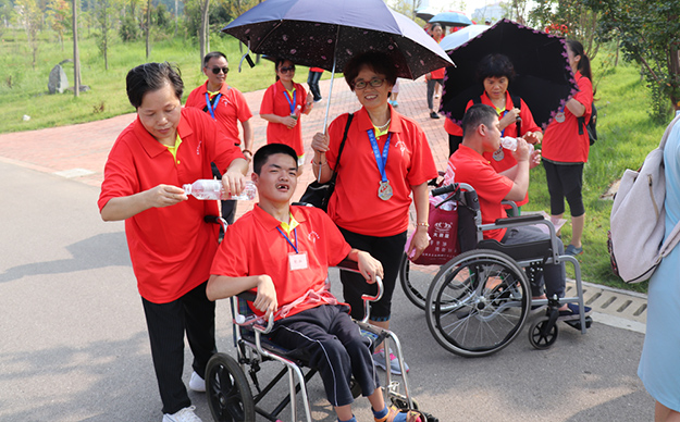 簡(jiǎn)短開(kāi)幕儀式以后,“走長(zhǎng)城”(長(zhǎng)沙站)公益活動(dòng)正式開(kāi)始。來(lái)自社會(huì)各界的愛(ài)心志愿者們從南大門(mén)出發(fā),按照指定的路線(xiàn)沿著西湖文化園開(kāi)始為愛(ài)行走。一路上,處處可見(jiàn)穿著統(tǒng)一的紅色公益文化衫的愛(ài)心志愿者,他們有的三五成群,奮力競(jìng)走,好似團(tuán)隊(duì)之間在進(jìn)行小比拼;有的一家三口全員出動(dòng),帶著小孩漫步在西湖畔,沉浸在感知愛(ài)、傳遞愛(ài)、奉獻(xiàn)愛(ài)的氛圍。行走的隊(duì)伍中,還有一些借助輪椅、助行器步伐緩慢的孩子,他們是長(zhǎng)沙彩虹晨光中心的孤殘兒童。行動(dòng)不便的他們?cè)谥驹刚叩臄v扶與鼓勵(lì)中,克服身體障礙,堅(jiān)毅前行,挑戰(zhàn)5公里行走。行走的愛(ài)心志愿者隊(duì)伍很快便吸引了不少周邊民眾的廣泛關(guān)注,在此休閑、晨練的民眾們從志愿者處了解到此次公益活動(dòng)的目的后深受感動(dòng),自覺(jué)加入到愛(ài)心隊(duì)伍當(dāng)中,一起為公益行走。