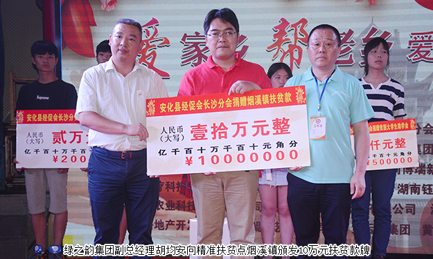 2017年8月13日晚,湖南安化經(jīng)促會長沙分會舉辦的“愛家鄉(xiāng)·幫老鄉(xiāng)”募捐晚會在長沙茉莉花大酒店成功舉行。綠之韻集團(tuán)副總經(jīng)理胡均安、夏運(yùn)良親臨大會現(xiàn)場,帶領(lǐng)綠之韻愛心志愿者、安化籍員工以實(shí)際行動支持家鄉(xiāng)災(zāi)后重建,回報(bào)桑梓。