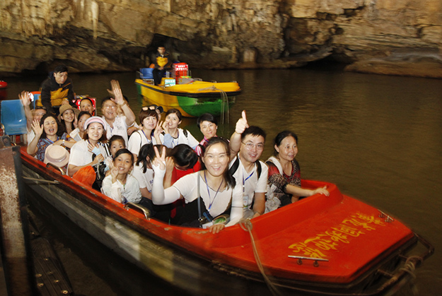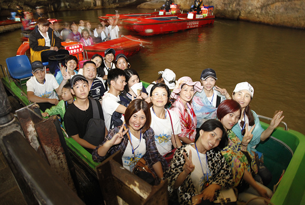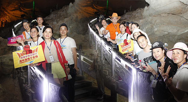 炙陽(yáng)高照,黃龍洞自然空調(diào)帶來(lái)的清涼是送給伙伴們的第一份禮物。黃龍洞是“世界溶洞全能冠軍”,超過(guò)10萬(wàn)平方米的龐大洞穴空間,立體的洞穴結(jié)構(gòu),高大的洞穴瀑布,寬闊的龍宮廳及數(shù)以萬(wàn)計(jì)的石筍,仿佛一座神奇的地下“魔宮”。綠之韻家人們穿梭其中,無(wú)所不奇,無(wú)奇不有,深深陶醉在大自然神奇的懷抱里,驚嘆不已。