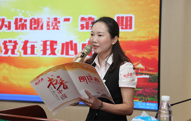 為激發(fā)全員愛黨、愛國(guó)、愛崗熱情,著力打造學(xué)習(xí)型企業(yè),2017年6月29日,綠之韻集團(tuán)黨委組織開展了“我為你朗讀”第一期《黨在我心中》活動(dòng)。綠之韻集團(tuán)副總裁劉淑娟、副總經(jīng)理胡均安、綠之韻集團(tuán)黨委書記劉云、副書記許達(dá)仲、綠之韻集團(tuán)總裁助理蔣文受邀擔(dān)任本次比賽評(píng)委。來自綠之韻集團(tuán)支部、綠之韻分公司支部、綠之韻國(guó)際大酒店支部、綠之韻保健日用品支部的8名選手參加本次朗讀比賽。綠之韻集團(tuán)團(tuán)委書記王壯擔(dān)任主持。