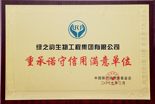 中國保護消費者基金會根據(jù)《消費者權(quán)益保護法》所賦予的職能和職責(zé),以保護消費者合法權(quán)益、提高消費者地位、推進保護消費者事業(yè)的發(fā)展為宗旨,在全國范圍內(nèi)開展保護消費者權(quán)益相關(guān)工作。綠之韻集團認(rèn)真貫徹執(zhí)行《消費者權(quán)益保護法》《產(chǎn)品質(zhì)量法》《廣告法》及其他相關(guān)法律法規(guī),嚴(yán)格按照國家的行業(yè)規(guī)定與質(zhì)量標(biāo)準(zhǔn)組織生產(chǎn),積極接受政府各職能部門、消費者組織和廣大消費者監(jiān)督,經(jīng)過中國保護消費者基金會及活動評審組的層層評審,被光榮授予“重承諾守信用滿意單位”稱號。