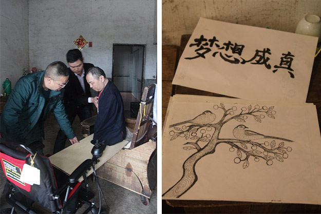 導(dǎo)讀:借助由綠之韻公益基金會(huì)捐贈(zèng)的電動(dòng)輪椅,周國民實(shí)現(xiàn)了自己自由行動(dòng)的夢想,他感恩、興奮,迫不及待的想熟練掌握電動(dòng)輪椅的使用方法,將身體從自己設(shè)計(jì)請(qǐng)人制作的木制手工輪椅當(dāng)中解放出來,最大的愿望是:畫他的畫,有一天能辦自己個(gè)人的書畫展,實(shí)現(xiàn)自己人生的人生價(jià)值。