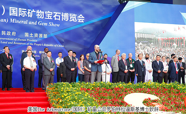 開幕式上,郴州市委書記易鵬飛、國外展商代表羅伯特?拉溫斯基、墨西哥代總領(lǐng)事熊羽分別致辭。美國圖森展原主席彼得?梅高、澳大利亞昆士蘭博物館聯(lián)盟主任蘇珊?米勒、美國著名礦物寶石收藏家基因?梅爾安等境外嘉賓,中國科學(xué)院院士莫宣學(xué),國土資源部、湖南省委、省人大、省政府、省政協(xié)領(lǐng)導(dǎo),國家相關(guān)部辦委領(lǐng)導(dǎo),礦博會組委會成員單位領(lǐng)導(dǎo),行業(yè)協(xié)會、礦山企業(yè)、參展商代表,50多家新聞媒體記者及群眾代表等參加了開幕式。