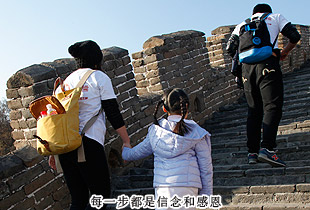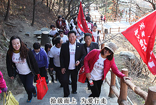 由于行進道路比較狹窄、坡度較大,大家三五成群,從慕田峪長城入口的中華夢石城出發(fā),沿著北步道,一路意志堅定,沿著幾里長陡峭的石階拾級而上,手拉著手歡呼雀躍地向著長城10號炮臺進發(fā)。在這條人流中,匯聚著綠之韻愛心經(jīng)銷商、公務(wù)員、知識分子、企業(yè)老板、務(wù)工人員、學(xué)生……他們彼此并不相識,博愛的名義卻把他們緊緊連在了一起。相識的、不相識的,大家揮舞慈善紅旗,以眼神鼓勁,用微笑問候,朝著一個共同的夢想、共同的愛心、共同的追求徒步前行。共沐大愛的心靈長河,誰人又不被感動呢?