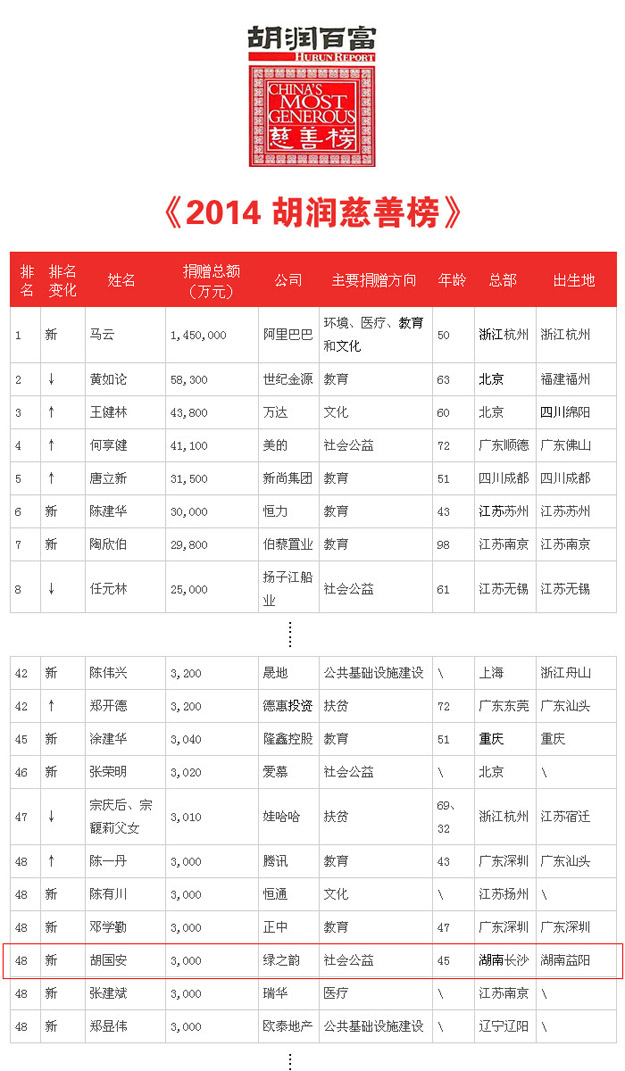 10月28日,《2014胡潤慈善榜》正式對外發(fā)布。在這份榜單當中,5家直銷企業(yè)紛紛上榜,綠之韻集團位列第4。在本統(tǒng)計年度中有3位非企業(yè)家身份的慈善家上榜,分別是朱镕基、徐紹村和李春平。前100位上榜慈善家變化巨大,有71位新上榜慈善家,歷年最多。從總體來看,前100名上榜慈善家中,有18位新的地區(qū)首善;從出生地來看,有13位新的地方首善誕生。本次包括胡國安董事長在內(nèi),湖南僅有兩位企業(yè)家上榜,胡國安董事長捐贈3000萬元,位列第48位。阿里巴巴的馬云以145億元捐贈額刷新中國慈善記錄,成為新一屆“中國最慷慨的慈善家“;世紀金源的黃如論以5.8億元的捐贈額排名第二;60歲的王健林以4.4億元的捐贈額位列第三。