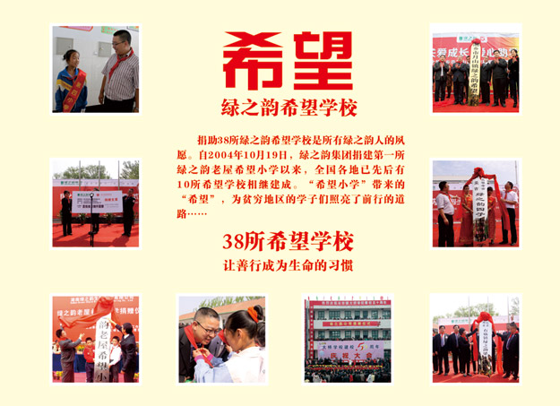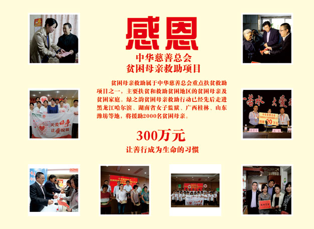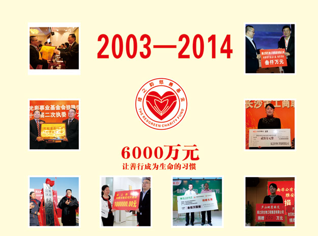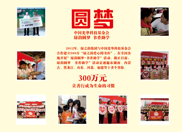 今年是胡潤慈善榜十周年,同時也是綠之韻集團成立的第十一個年頭。十一年來,綠之韻集團在胡國安董事長帶領(lǐng)下,踴躍參與和傾情捐助了教育、關(guān)愛老人、賑災(zāi)、扶貧、幫困等多項社會慈善事業(yè),用實際行動履行著企業(yè)應(yīng)盡的責任和義務(wù),如:在全國各地先后援建了10所希望小學(xué)、陸續(xù)投入1000萬元開展“樹人行動”、投入300萬元在全國各地開展“綠韻圓夢?書香助學(xué)”活動、向湖南省光彩事業(yè)基金捐贈3000萬元促進“老、少、邊、窮”地區(qū)的經(jīng)濟發(fā)展和社會進步、捐資300萬專項扶貧基金開展“關(guān)愛貧困母親”行動。截止目前,綠之韻集團已累計捐贈款物達6000多萬元,贏得了社會各界的廣泛關(guān)注和好評。2014年9月23日,中華慈善總會成立20周年紀念會在北京舉行,綠之韻集團被光榮授予“中國慈善突出貢獻獎“。