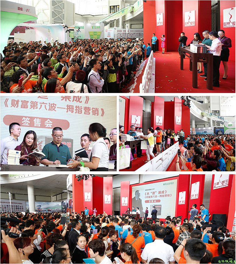 連續(xù)暢銷七年,首次發(fā)行百萬冊,《財富第六波—在家創(chuàng)業(yè)》被譽為作為一本影響中國人未來十年生活方式的創(chuàng)富圣經(jīng)一直影響深遠(yuǎn)。2013年胡國安董事長接連推出了《財富第六波—在家創(chuàng)業(yè)》的姊妹篇《財富第六波—拇指營銷》和解析中華水文化力作《水道渠成》,再次引爆市場。上午10:18,胡國安董事長親臨嘉年華現(xiàn)場簽售。新書簽售展區(qū)前,萬余名伙伴的到來讓現(xiàn)場排起了長龍,氣氛異常火爆,不到1個小時近5000冊《財富第六波—拇指營銷》和《水道渠成》就搶售一空。