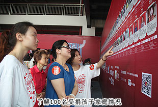 九點(diǎn),主辦方宣布活動開始。踴躍的綠之韻愛心志愿者們雖著急捐款,卻井然有序。他們在門口排成長隊,依次進(jìn)入。而坐在座位上,期盼著好心人的孩子們沿著活動大廳周邊坐著,等待著捐款。每位孩子旁邊各有一位工作人員協(xié)助接受捐贈并開具票據(jù)。在孩子們背后的墻上,滿滿當(dāng)當(dāng)?shù)膶懼麄兤D苦的經(jīng)歷。有父母早逝,離異,從小與年邁的爺爺奶奶相依為命的孩子;也有家人重病,為治病負(fù)債累累,居無定所的孩子;還有家中毫無經(jīng)濟(jì)支撐,又逢天災(zāi),消瘦如骨的孩子;他們每個人都十分拮據(jù),溫飽都解決不了,生活更難以為繼,但是面對困難,他們臉上所透出的是不屈不撓。雖然在夾縫中生存著,卻大多能保持向上的心,從小便養(yǎng)成了勤奮、懂事、好學(xué)的好習(xí)慣,這些無不感動現(xiàn)場的愛心人士。
