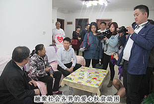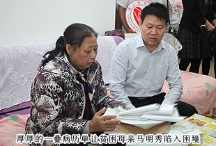 貧困母親馬明秀,患有尿毒癥,丈夫同樣身體抱病,一摞厚厚的病歷單成為這個(gè)家庭最刺眼的標(biāo)簽。桌子上各種各樣的藥罐子,是每月2000多醫(yī)療費(fèi)用的產(chǎn)物,當(dāng)失去了經(jīng)濟(jì)來源,生的希望就無情地熄滅了??墒?,當(dāng)迎來慰問隊(duì)伍,收到各界的關(guān)懷之后,馬明秀說:“我曾經(jīng)失去過活下去的勇氣,但是社會(huì)各界的關(guān)心,讓我又擁有了對(duì)抗病魔的勇氣,我一定會(huì)好好活下去,帶給家人和社會(huì)精神上的正能量?!?br/>