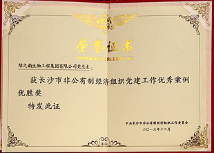 2013年12月25日,毛澤東同志誕辰120周年紀(jì)念日前一天,綠之韻集團(tuán)黨總支部光榮地被中共長(zhǎng)沙市非公有制經(jīng)濟(jì)組織工作委員會(huì)授予“長(zhǎng)沙市非公有制經(jīng)濟(jì)組織黨建工作優(yōu)秀案例優(yōu)勝單位”稱號(hào),其先進(jìn)事跡和黨建工作經(jīng)驗(yàn)成功入選《長(zhǎng)沙市非公有制經(jīng)濟(jì)組織黨建工作優(yōu)秀案例匯編《領(lǐng)航》一書,在全市范圍內(nèi)進(jìn)行宣傳推廣。