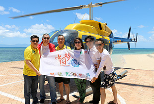深藍的海水會讓人害怕,總覺得平靜的海水下面有很多可怕的生物??墒沁@種比淡藍深一點,比深藍淺一點的海面,美得讓人都快窒息了。這么美得景色無法用語言來形容,只能靜靜感嘆大自然的魅力和神奇,不愧為世界八大奇跡之一。色彩絢麗的珊瑚和逾萬種獨特海洋物種構(gòu)成的海底奇景在直升機和潛水兩項活動中感受得淋漓精致。在凱恩斯乘坐熱氣球、直升機,在八百米的高空俯視晨曦中的大地,當熱烈燦爛的朝霞映紅臉膛的剎那,心境也豁然放達開來。在2000多米高的云霧間飄乎游蕩,呼吸著沁人肺腑的涼氣,凌空俯瞰成群的袋鼠在叢林溪流中嬉戲跳躍。俯瞰大堡礁,美得如夢如幻,這是一般人難以想象的體驗。胡國安董事長與大家一起乘坐直升飛機,綠之韻事業(yè)給每一位事業(yè)伙伴帶來“翱翔”的機會!綠之韻人的驚聲尖叫與縱情歡笑撒滿整個天空與海面,久久回蕩。