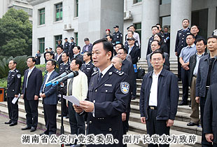 啟動儀式上,湖南省公安廳黨委委員、副廳長袁友方致辭:省委、省政府高度重視“規(guī)范執(zhí)法警營開放周”活動,要求各市州縣公安機關(guān)加強組織領(lǐng)導(dǎo),“一把手“要親自部署、親自抓落實,做到分工明確,責(zé)任到位,要做到全警參與;加強協(xié)調(diào)配合,統(tǒng)籌規(guī)劃,突出特色和亮點;要加大宣傳,擴大社會影響,利用各種新聞媒體加強宣傳、報道,擴大活動的社會影響,營造良好的社會輿論氛圍。
