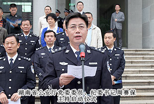 為充分展示五年來湖南省公安機關(guān)執(zhí)法規(guī)范化建設(shè)取得的成果,全面深化黨的群眾路線教育實踐活動,進(jìn)一步深入推進(jìn)規(guī)范執(zhí)法建設(shè)、和諧警民關(guān)系建設(shè),2013年10月28日上午,湖南省公安機關(guān)“規(guī)范執(zhí)法警營開放周”活動啟動儀式在長沙市公安局特巡警支隊院內(nèi)正式拉開帷幕。本次活動由湖南省公安廳黨委委員、紀(jì)委書記周賽保主持。