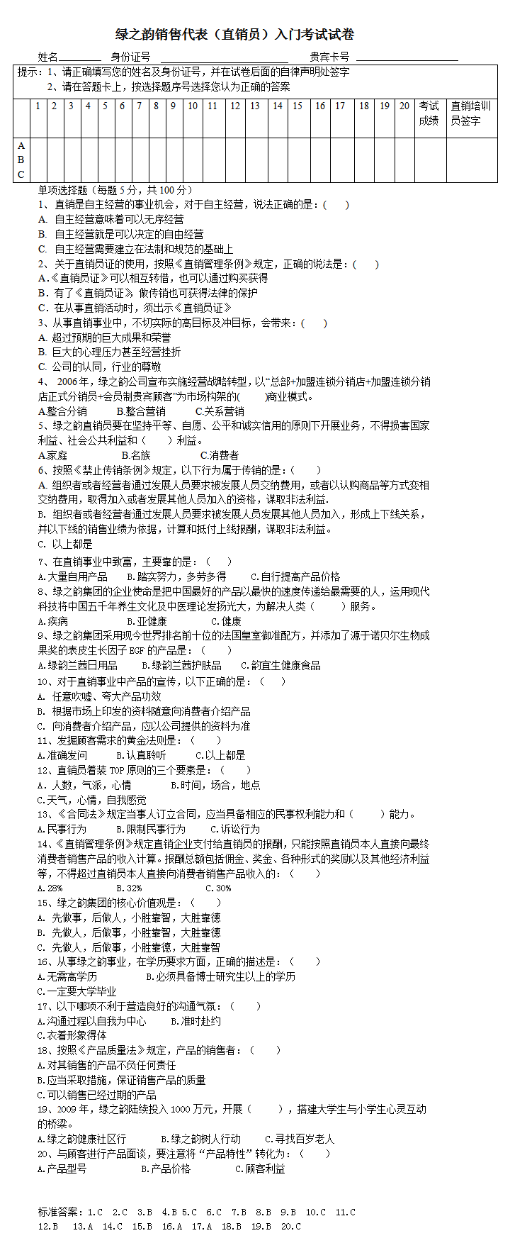直銷員入門考試試卷